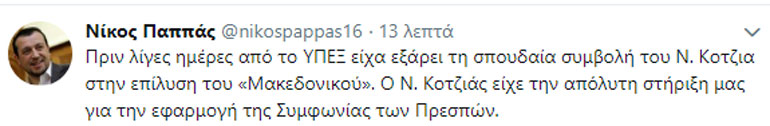 «Ο Νίκος Κοτζιάς είχε την απόλυτη στήριξή μας για την εφαρμογή της Συμφωνίας των Πρεσπών» ανέφερε σε ανάρτηση στο Twitter ο υπουργός Ψηφιακής Πολιτικής Νίκος Παππάς, λίγο μετά την αποπομπή του υπουργού Εξωτερικών, Νίκου Κοτζιά.