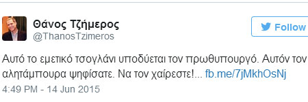 «Αυτό το εμετικό τσογλάνι υποδύεται τον πρωθυπουργό. Αυτόν τον αλητάμπουρα ψηφίσατε. Να τον χαίρεστε!» ήταν το μήνυμα του Θ. Τζήμερου στο tweeter.