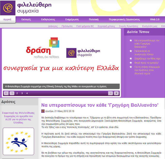 Από την πλευρά της η Φιλελεύθερη Συμμαχία που εκπροσωπείται από τον Γρηγόρη Βαλιανάτο εξέδωσε ανακοίνωση με τίτλο: «Να υπερασπιστούμε τον κάθε Γρηγόρη Βαλιανάτο» στην οποία αναφέρει τα εξής: