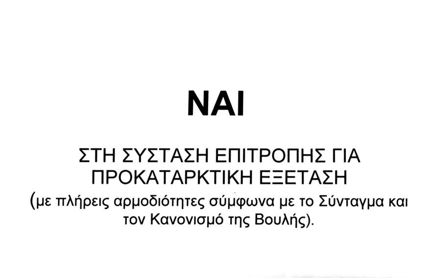 – Η ΔΗΣΥ ρίχνει σε όλες τις κάλπες ψηφοδέλτιο που αναγράφει “Ναι στην σύσταση Επιτροπής για Προκαταρκτική Εξέταση (με πλήρεις αρμοδιότητες σύμφωνα με το Σύνταγμα και τον Κανονισμό της Βουλής)”, το οποίο καταμετράται ως άκυρο.