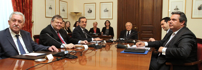 Έπειτα από δύο ώρες ολοκληρώθηκε η κρίσιμη σύσκεψη των πολιτικών αρχηγών υπό τον Κάρολο Παπούλια και η χώρα οδεύει σε εκλογές με υπηρεσιακό πρωθυπουργό, καθώς στο ύστατο ραντεβού των κ.κ. Σαμαρά, Βενιζέλου, Κουβέλη, Τσίπρα και Καμμένου δεν βρέθηκε η χρυσή τομή και οι διαβουλεύσεις κατέληξαν σε ναυάγιο.