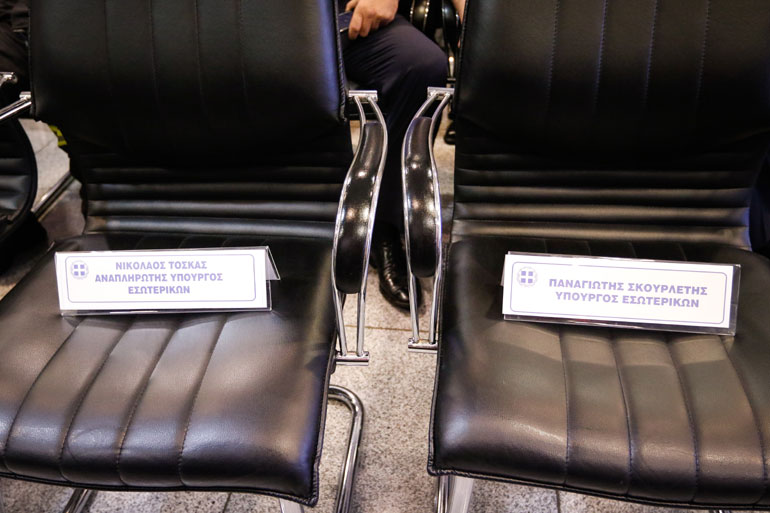 Τις αρμοδιότητες της Προστασίας του Πολίτη παρέλαβε ο ο υπουργός Εσωτερικών Πάνος Σκουρλέτης, το πρωί του Σαββάτου, από τον παραιτηθέντα αναπληρωτή υπουργό Προστασίας του Πολίτη Νίκο Τόσκα.