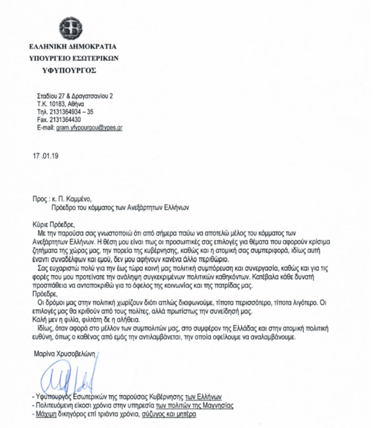 Όπως αναφέρει στην πρώτη παράγραφο της επιστολής της, «η θέση μου είναι πως οι προσωπικές σας επιλογές για θέματα που αφορούν κρίσιμα ζητήματα της χώρας μας, την πορεία της κυβέρνησης, καθώς και η ατομική σας συμπεριφορά, ιδίως αυτή έναντι συναδέλφων και εμού, δεν μου αφήνουν κανένα άλλο περιθώριο».