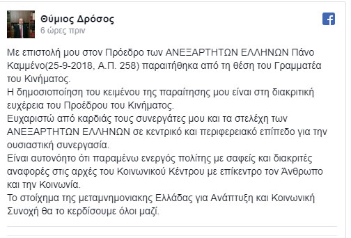 Την παραίτησή του από τη θέση του Γραμματέα των Ανεξαρτήτων Ελλήνων, υπέβαλλε στον Πάνο Καμμένο ο Θύμιος Δρόσος.