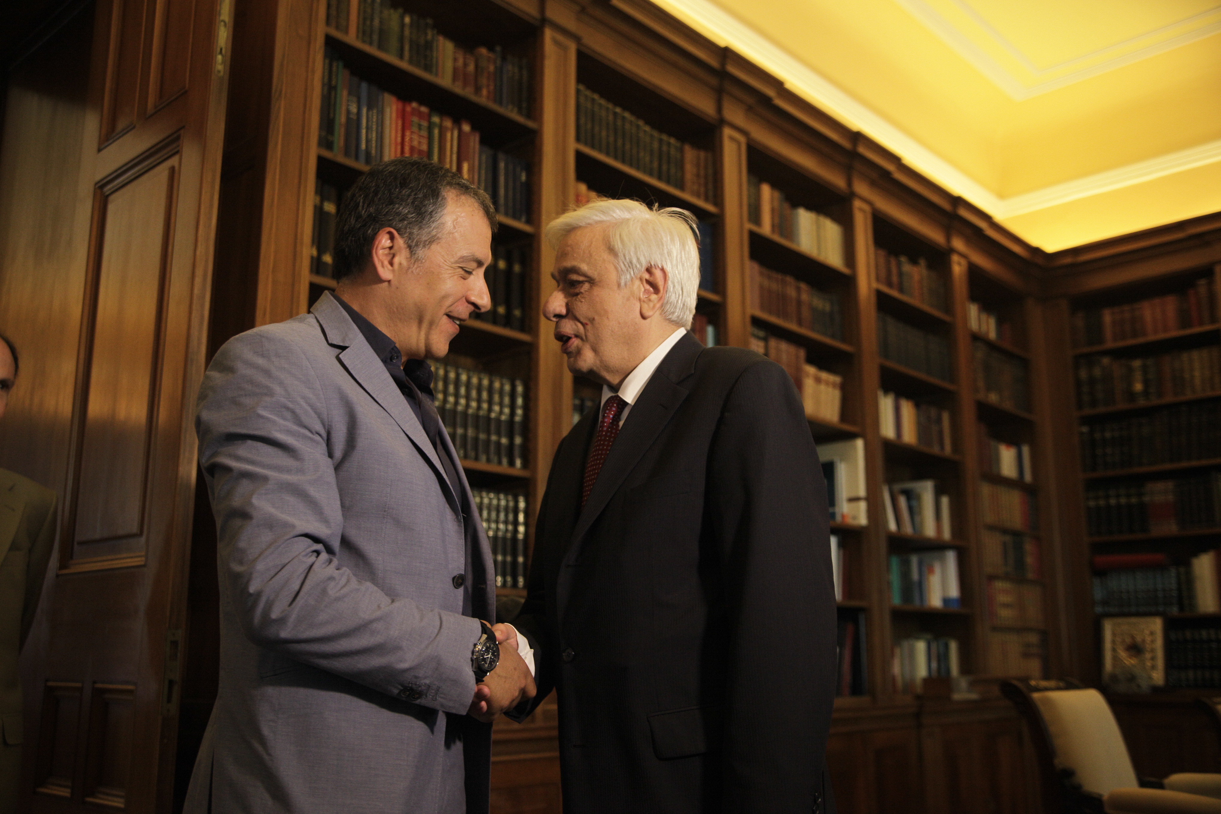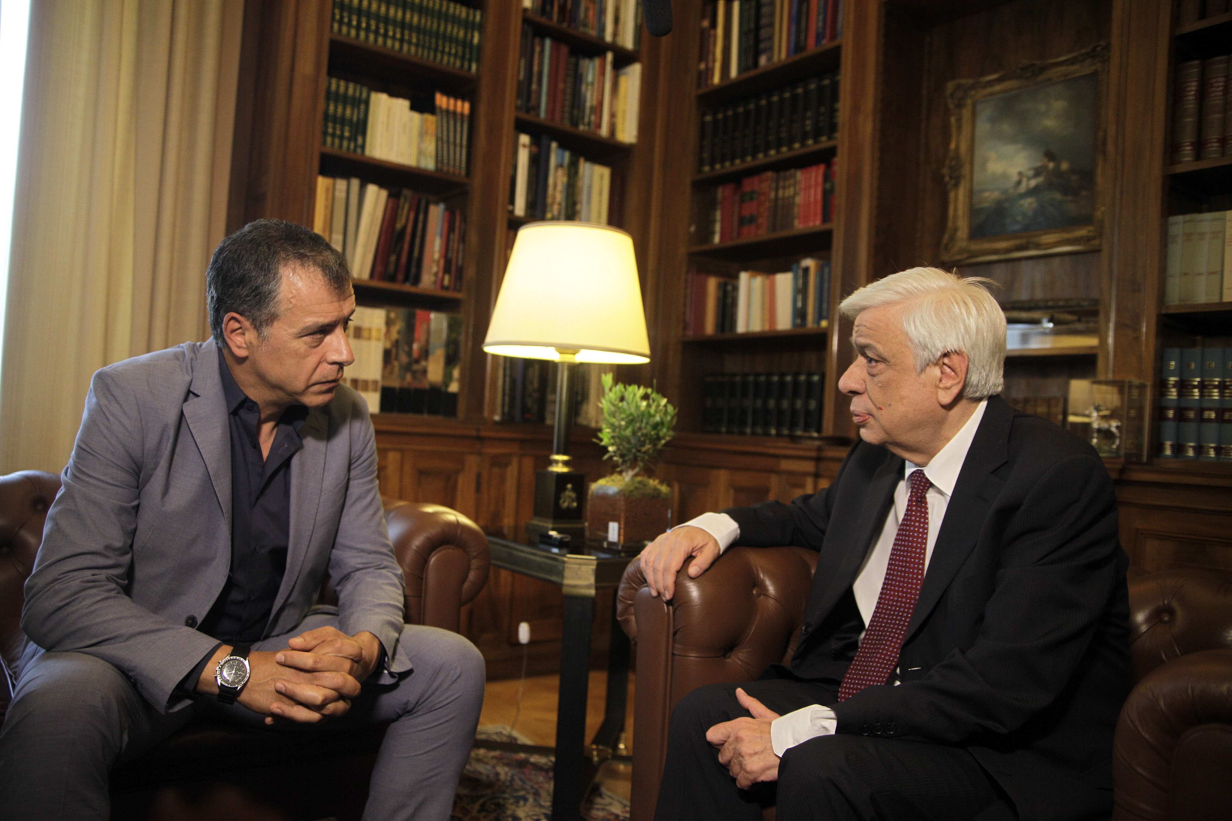 Από την πλευρά του ο κ. Θεοδωράκης αφού ευχαρίστησε τον Πρόεδρο της Δημοκρατίας για την άμεση ανταπόκριση στο αίτημά του για συνάντηση, τάχθηκε υπέρ των πατριωτικών λύσεων λέγοντας: «Πρέπει να δώσουμε πατριωτικές λύσεις και όχι κομματικές σε αυτή την υπόθεση. Ξέρω βέβαια, τους περιορισμούς που έχουν τεθεί μετά την Συνταγματική Αναθεώρηση, αλλά πιστεύω ότι ένας άνθρωπος σαν και σας, που έχετε θητεύσει δίπλα στον Κωνσταντίνο Καραμανλή, θα πρέπει να έχετε μια συμβολή μεγάλη, έστω και με τον λόγο σας σ΄αυτές τις πατριωτικές λύσεις που έχει ανάγκη η χώρα».