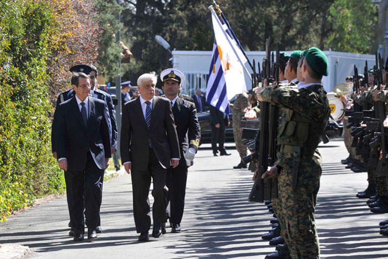 Ο Κύπριος Πρόεδρος στο γραφείο του και πριν αρχίσουν οι κατ’ ιδίαν συνομιλίες, απευθυνόμενος στον Πρόεδρο Πρ. Παυλόπουλο, επισήμανε ότι είναι γνωστό το ενδιαφέρον του για την Κύπρο και του ευχήθηκε καλή επιτυχία. «Προσβλέπουμε» είπε «σε στενότατη συνεργασία. Θα εισπράξετε την αγάπη του κυπριακού λαού ο οποίος έχει ανάγκη τη διαχρονική στήριξη της Ελλάδας».