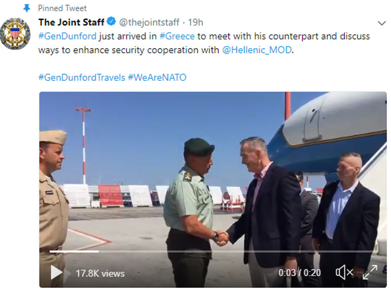 Στην Ελλάδα βρίσκεται από χθες, Δευτέρα, ο αρχηγός του Γενικού Επιτελείου των Ενόπλων Δυνάμεων των ΗΠΑ, στρατηγός Ιωσήφ Ντάνφορντ.