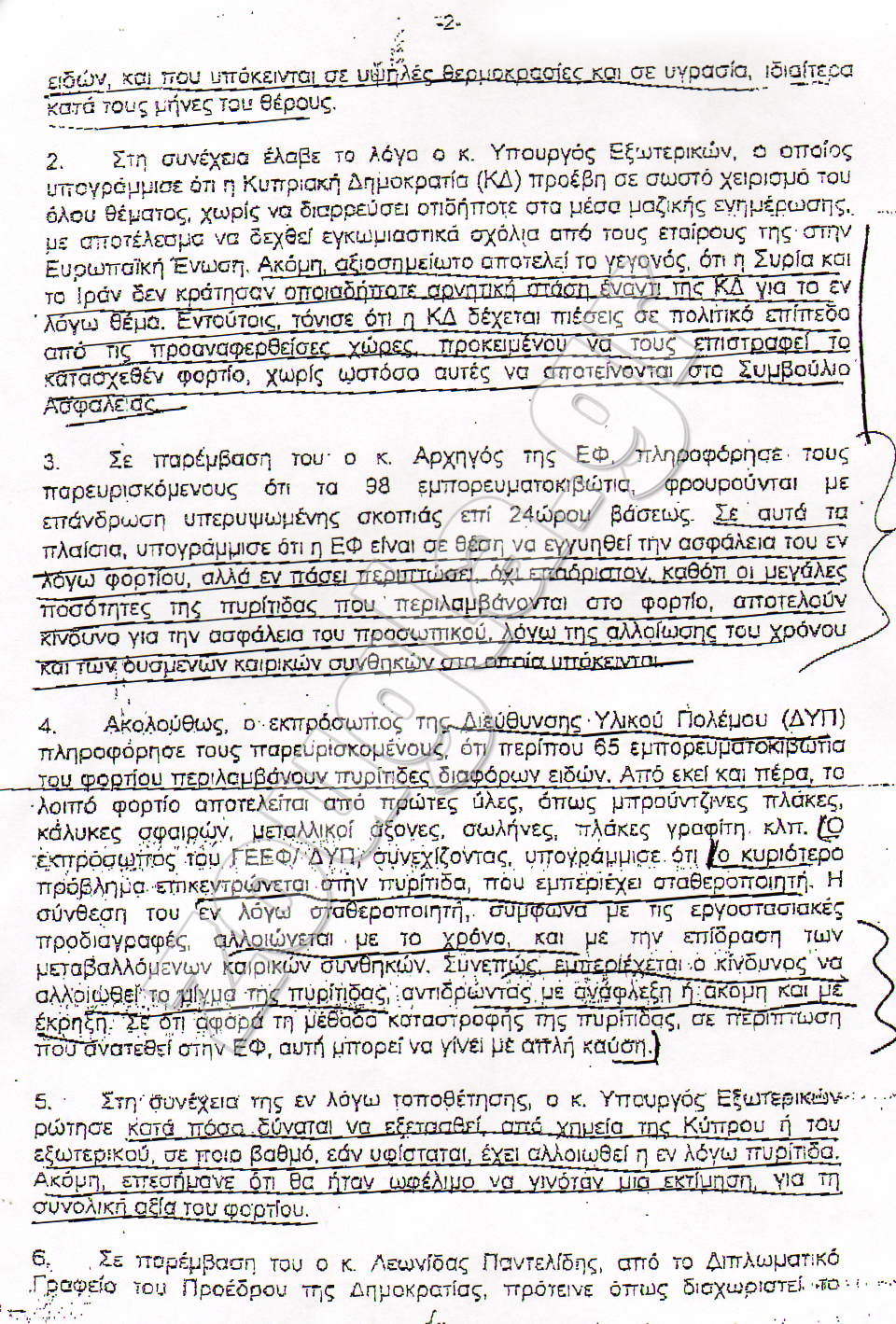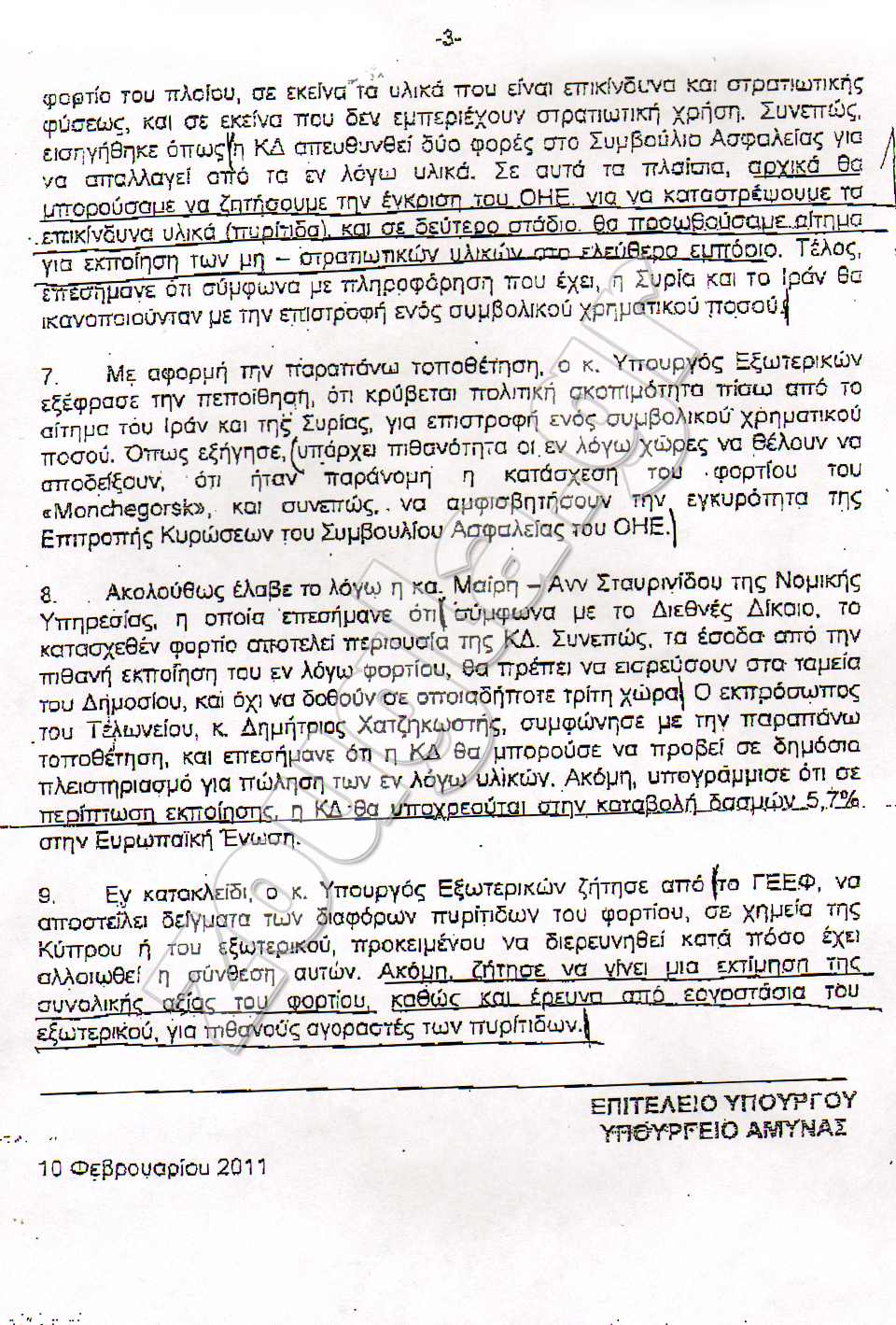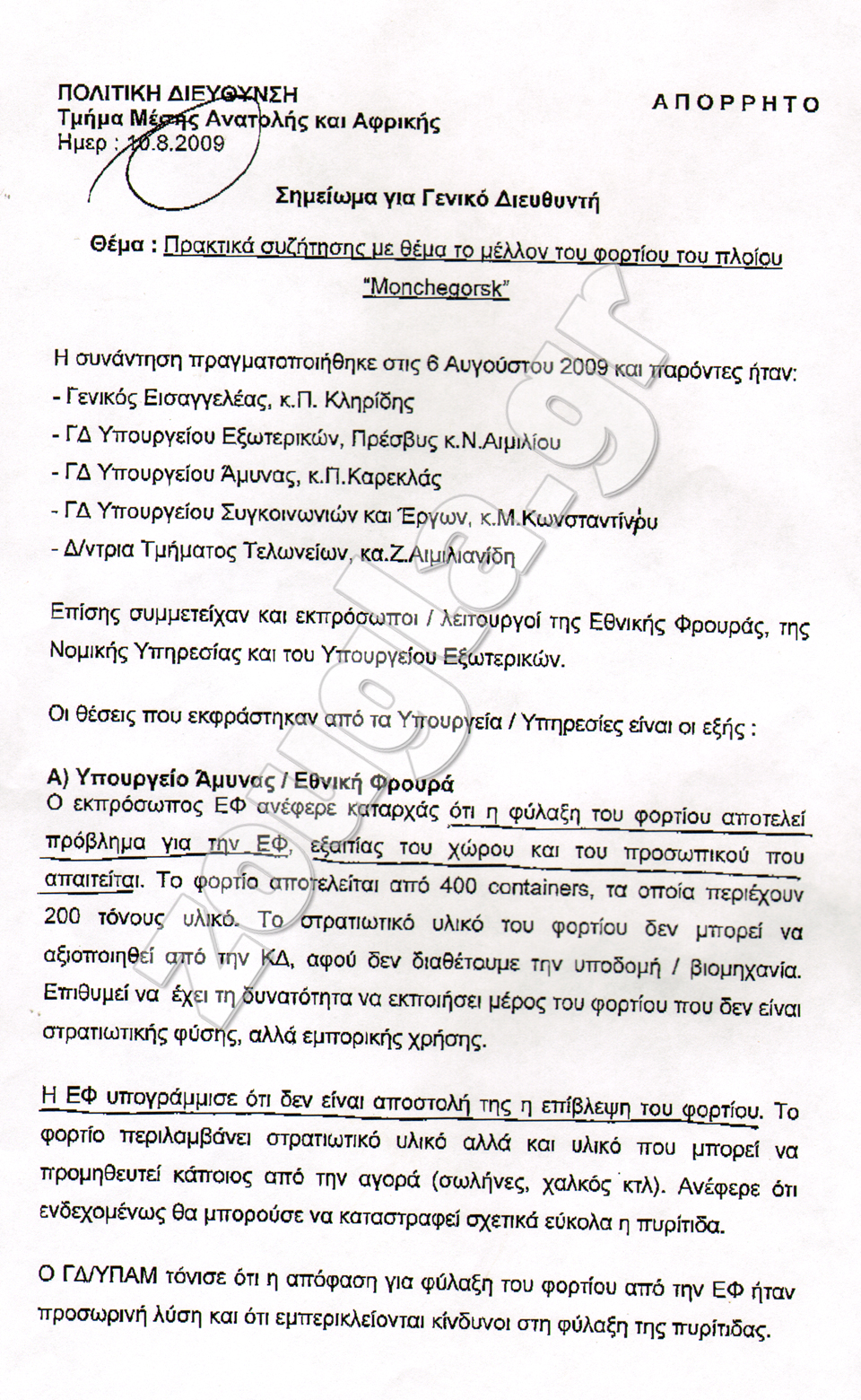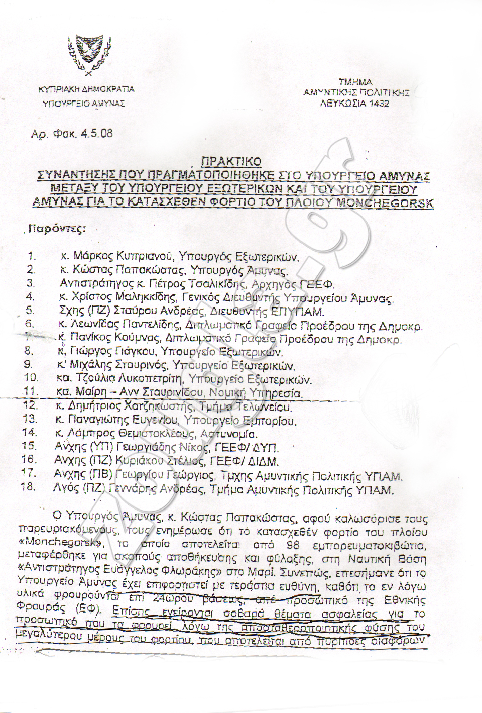 Απόρρητο έγγραφο που έρχεται στο φως της δημοσιότητας μαρτυρά τα πρακτικά της συζήτησης που πραγματοποιήθηκε στην Πολιτική Διεύθυνση του ΥΠΕΞ (Τμήμα Μέσης Ανατολής και Αφρικής) στις 06/08/09 μεταξύ του Γενικού Εισαγγελέα κ.Π.Κληρίδη και των Γενικών Διευθυντών των Υπουργείων Εξωτερικών, Υπουργείου Άμυνας, Υπουργείο Συγκοινωνιών και Έργων Διευθυντών Τελωνείων και εκπροσώπων της Εθνικής Φρουράς με θέμα το μέλλον του φορτίου του υπό Κυπριακής σημαίας πλοίου «Morchegorsk», που είχε ναυλωθεί από το Ιραν και μετέφερε Ιρανικής προέλευσης στρατιωτικό υλικό (πυρομαχικά, εκρηκτικά, συμπιεσμένη πυρίτιδα, κάλυκες) στη Συρία.