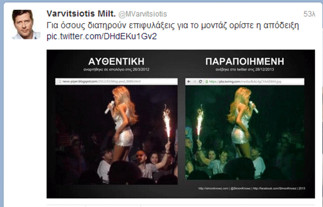 Πριν από λίγο, άλλωστε, μέσω του προσωπικού του λογαριασμού στο Τwtter ανάρτησε την πραγματική φωτογραφία, αντιπαραβάλλοντάς τη με την παραποιημένη που βγήκε χθες στη δημοσιότητα, γράφοντας: «Για όσους διατηρούν επιφυλάξεις για το μοντάζ, ορίστε η απόδειξη».