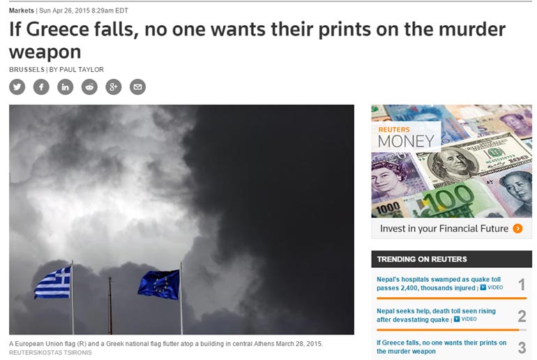 «Χρεοκοπούμε.» «Όχι, δεν χρεοκοπείτε.» «Μας πνίγετε.» «Όχι, δεν σας πνίγουμε.» «Μας χρωστάτε για τον Β΄ Παγκόσμιο Πόλεμο.» «Δώσαμε, δώσαμε.» Έτσι ξεκινάει το άρθρο του το πρακτορείο Reuters, με τίτλο «Αν η Ελλάδα καταρρεύσει, κανείς δεν θέλει τα δαχτυλικά του αποτυπώματα στο φονικό όπλο».