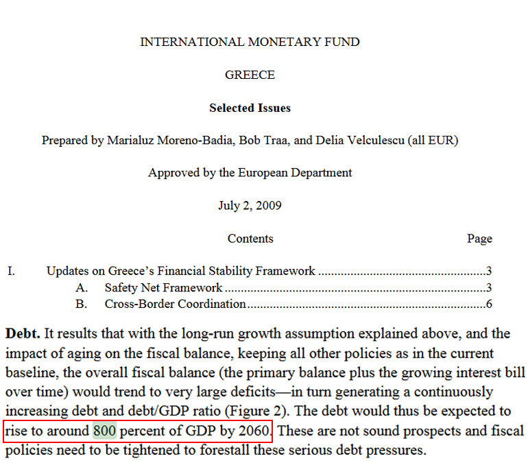 Αναζητήσαμε και βρήκαμε τη συγκεκριμένα έκθεση με συντάκτες τον κ. Μπομπ Τράα, αλλά και τη γνώριμη πλέον σε όλους, Ντέλια Βελκουλέσκου, η οποία συνεχίζει τις διαπραγματεύσεις με την κυβέρνηση ΣΥΡΙΖΑ στο… Hilton. Σε αυτήν την έκθεση αναφερόταν ότι το χρέος μπορεί να εκτιναχθεί στο 800% του ΑΕΠ έως το 2060.