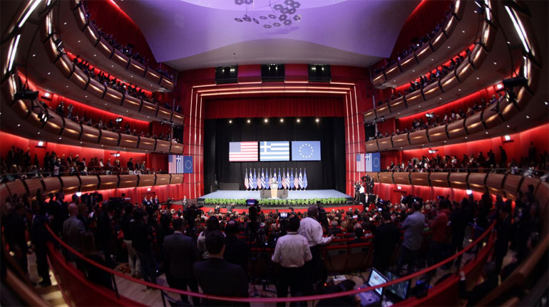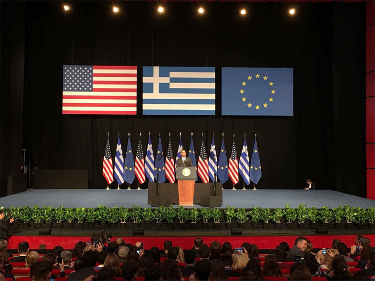 Με μία ομιλία-παρακαταθήκη ο απερχόμενος Πρόεδρος των ΗΠΑ θέλησε να τονίσει τα πλεονεκτήματα του δυτικού κόσμου και της Δημοκρατίας ενώπιον ενός ενθουσιώδους κοινού, 1200 ατόμων περίπου, στο Κέντρο Πολιτισμού «Ίδρυμα Σταύρος Νιάρχος».