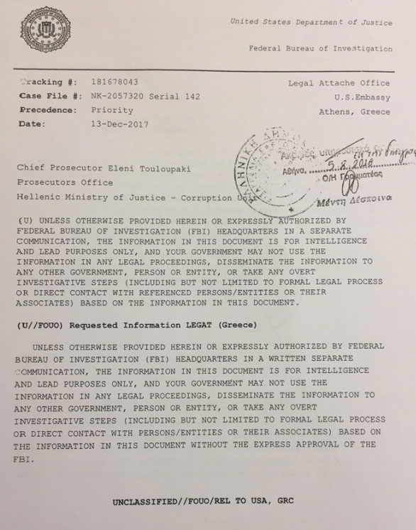Σε ενημερωτικό έγγραφο, το οποίο αποστέλλει η αμερικανική υπηρεσία στην εισαγγελέα διαφθοράς