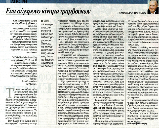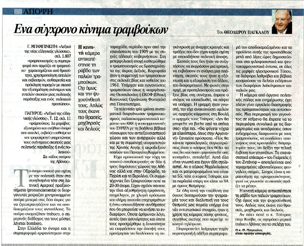 Τρεις εχθρούς εντοπίζει ο Θεόδωρος Πάγκαλος, με παρέμβασή του, στην εφημερίδα «Βήμα της Κυριακής» και με άρθρο που τιτλοφορείται «Ένα σύγχρονο κίνημα τραμβούκων».