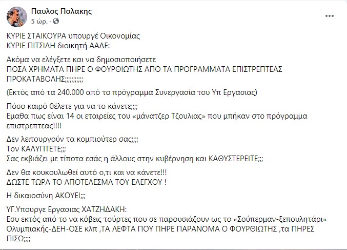 O πρώην υπουργός, ρωτά εκ νέου την κυβέρνηση σχετικά με τα πόσα χρήματα πήρε  ο Μένιος Φουρθιώτης από τα προγράμματα επιτρεπτέας προκαταβολής, ενώ απευθύνεται στους κυρίους Σταϊκούρα, Πιτσιλή και Χατζηδάκη και αναρωτιέται: «πόσο χρόνο χρειάζονται για να μάθουμε και αν πήραν πίσω τα χρήματα και πόσα». Παράλληλα διερωτάται εάν η κυβένρηση καλύπτει τον παρουσιαστή.