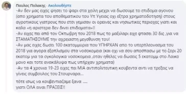 «Αν δεν μας είχες ψήσει το ψάρι στα χείλη μέχρι να δώσουμε το επίδομα άγονου (από χρήματα του αποθεματικού του υπουργείου Υγείας, όχι έξτρα χρηματοδότηση) στους αγροτικούς γιατρούς που έτσι γέμισαν οι ορεινές και νησιωτικές περιοχές γιατί και καλά «η αριστερά δεν δίνει επιδόματα»!!