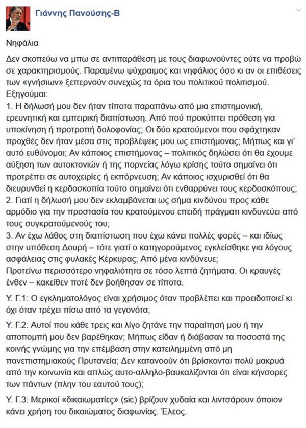«Παραμένω ψύχραιμος και νηφάλιος όσο και αν οι επιθέσεις των ‘γνήσιων’ ξεπερνούν συνεχώς τα όρια του πολιτικού πολιτισμού… Η δήλωσή μου δεν αποτελεί τίποτα παραπάνω από μια επιστημονική, ερευνητική και εμπειρική διαπίστωση… Αυτοί που κάθε τρεις και λίγο ζητάνε την παραίτησή μου ή την αποπομπή μου δεν βαρέθηκαν; Μήπως είδαν ή διάβασαν τα ποσοστά της κοινής γνώμης για την επέμβαση στην κατειλημμένη από μη πανεπιστημιακούς Πρυτανεία; Δεν κατανοούν ότι βρίσκονται πολύ μακρυά από την κοινωνία και απλώς αυτο-αλληλο-βαυκαλίζονται ότι είναι κήνσορες των πάντων (πλην του εαυτού τους)» και ακόμα «Μερικοί “δικαιωματίες” (sic) βρίζουν χυδαία και λιντσάρουν όποιον κάνει χρήση του δικαιώματος διαφωνίας. Έλεος».