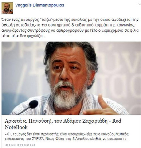 «Όταν ένας υπουργός “ταΐζει”-μέσω της ευκολίας με την οποία αποδέχεται την ύπαρξη αυτοδικίας-το πιο συντηρητικό & εκδικητικό κομμάτι της κοινωνίας, αναγκάζοντας συντρόφους να αρθρογραφούν με τέτοιο περιεχόμενο σε φίλια μέσα τότε δεν ψιχαλίζει» ανέφερε σε άρθρο που έγραψε ο κ. Διαμαντόπουλος, που τιτλοφορείται «Αρκετά κύριε Πανούση».