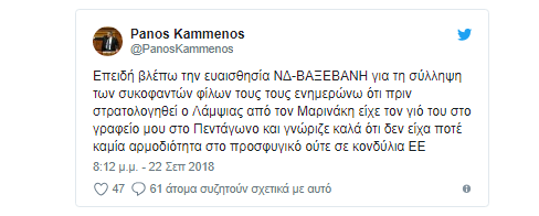 Λίγο νωρίτερα o Πάνος Καμμένος είχε αναρτήσει το εξής tweet: «Επειδή βλέπω την ευαισθησία ΝΔ-ΒΑΞΕΒΑΝΗ για τη σύλληψη των συκοφαντών φίλων τους τους ενημερώνω ότι πριν στρατολογηθεί ο Λάμψιας από τον Μαρινάκη είχε τον γιό του στο γραφείο μου στο Πεντάγωνο και γνώριζε καλά ότι δεν είχα ποτέ καμία αρμοδιότητα στο προσφυγικό ούτε σε κονδύλια ΕΕ».