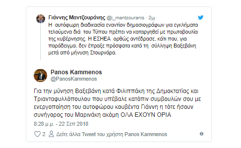 O Πάνος Καμμένος απάντησε ως εξής: «Για την μήνυση Βαξεβάνη κατά Φιλιππάκη της Δημοκρατίας και Τριανταφυλλόπουλου που υπέβαλε κατόπιν συμβουλών σου με ενεργοποίηση του αυτοφώρου κουβέντα Γιάννη η τότε ήσουν συνήγορος του Μαρινάκη ακόμη ΟΛΑ ΕΧΟΥΝ ΟΡΙΑ».