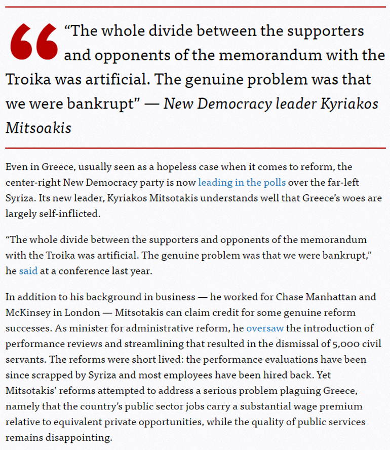 Παρά το γεγονός ότι οι μεταρρυθμίσεις του κ. Μητσοτάκη στη δημόσια διοίκηση που ξεκίνησε ως υπουργός Διοικητικής Μεταρρύθμισης και οι οποίες συνέβαλαν στο να αντιληφθούν οι πιστωτές της Ελλάδας ότι εκτός από τους ποσοτικούς στόχους υπάρχουν και οι αναγκαίες για τους πολίτες ποιοτικές αλλαγές, απορρίφτηκαν από την κυβέρνηση ΣΥΡΙΖΑ μόλις αυτή ανέλαβε τη διακυβέρνηση της χώρας τον Ιανουάριο του 2015, ο αρθρογράφος τονίζει ότι ο κ. Μητσοτάκης πραγματικά προσπάθησε να αντιμετωπίσει το χάσμα που υπάρχει ανάμεσα στα προνόμια της δημόσιας διοίκησης και των υπηρεσιών που πράγματι προσφέρουν στους Έλληνες πολίτες.