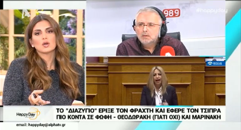 Είναι χαρακτηριστικό ότι κατά τη παρέμβαση του δημοσιογράφου Δήμου Βερύκιου στην επίμαχη αυτή πρωινή εκπομπή αναγράφεται στο super το ερώτημα αν μεταξύ των άλλων ο κ. Τσίπρας τα βρήκε με τον κ. Μαρινάκη.