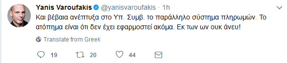 Συγκεκριμένα, ο κ. Βαρουφάκης έγραψε στο Twitter: «Και βέβαια ανέπτυξα στο υπουργικό συμβούλιο το παράλληλο σύστημα πληρωμών. Το ατόπημα είναι ότι δεν έχει εφαρμοστεί ακόμα! Εκ των ων ουκ άνευ!».