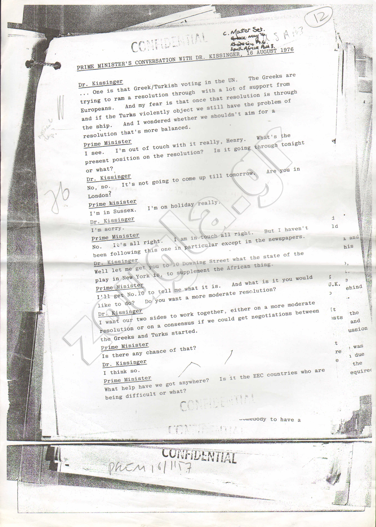 Κίσινγκερ: […] Οι Έλληνες προσπαθούν να επιβάλουν ένα ψήφισμα και έχουν μεγάλη στήριξη από τους Ευρωπαίους. Φοβάμαι ότι εάν όντως περάσει και οι Τούρκοι αντιδράσουν βιαίως, εμείς και πάλι θα έχουμε το πρόβλημα με εκείνο το σκάφος. Έλεγα λοιπόν μήπως θα έπρεπε να επιδιώξουμε ένα πιο ισορροπημένο ψήφισμα.