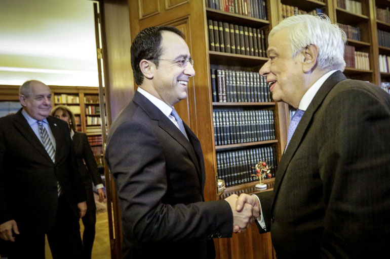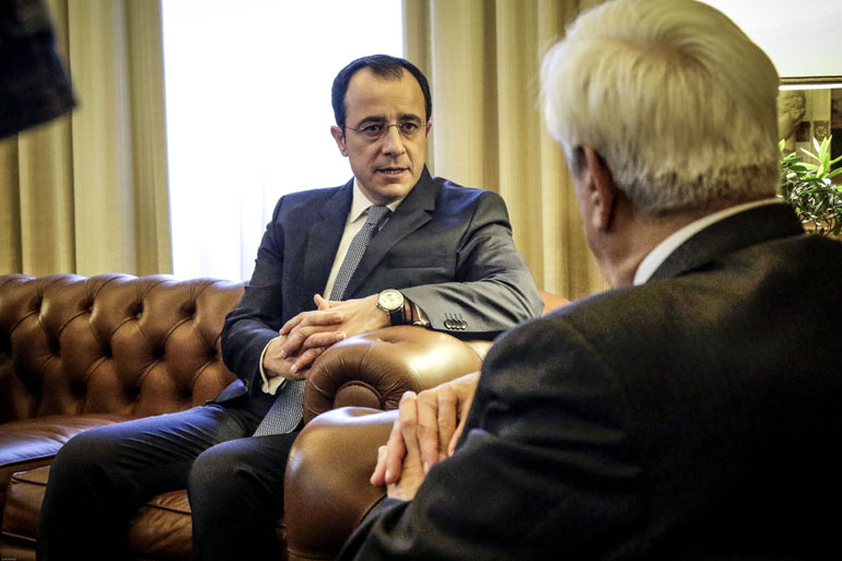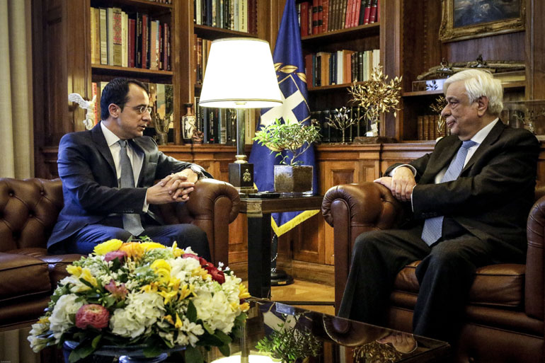 Από τη μεριά του, ο νέος υπουργός Εξωτερικών της Κυπριακής Δημοκρατίας Νίκος Χριστοδουλίδης, αφού μετέφερε στον κ. Παυλόπουλο τις ευχαριστίες του Κύπριου προέδρου Νίκου Αναστασιάδη και του κυπριακού λαού για τη συνεχή στήριξη στις προσπάθειες τερματισμού της κατοχής και επανένωσης της Κύπρου, υπογράμμισε ότι «παρά τις όποιες αρνητικές προσεγγίσεις και συμπεριφορές της Τουρκίας, εμείς δεν θα παρασυρθούμε σε ενέργειες που ενδεχομένως θα ήθελε να μας οδηγήσει η Τουρκία», επισημαίνοντας ότι «δεν αποπροσανατολιζόμαστε από τον στόχο μας, αλλά ενεργούμε με σύνεση και ψυχραιμία».