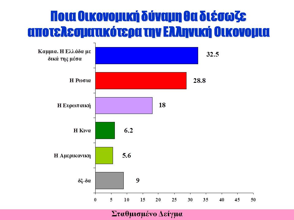 Στο τέταρτο ερώτημα αυτής της ενότητας οι πολίτες καλούνται να επιλέξουν την οικονομική δύναμη η οποία δυνητικά θα μπορούσε να διασώσει την Ελλάδα από την κρίση. Πρώτη στις επιλογές έρχεται η άποψη πως η χώρα θα εξέλθει της κρίσης στη βάση των δικών της προσπαθειών και με τα δικά της μέσα. Ακολουθεί η άποψη πως η Ρωσία θα μπορούσε να διασώσει την ελληνική οικονομία και μόνον ως τρίτη επιλογή κατατάσσεται η Ευρώπη ως εν δυνάμει διασώστης της χώρας. Εντύπωση προκαλεί το γεγονός πως μόνον ένα ισχνό ποσοστό επενδύει στο ενδεχόμενο μιας αμερικανικής βοήθειας ικανής να σώσει την χώρα.