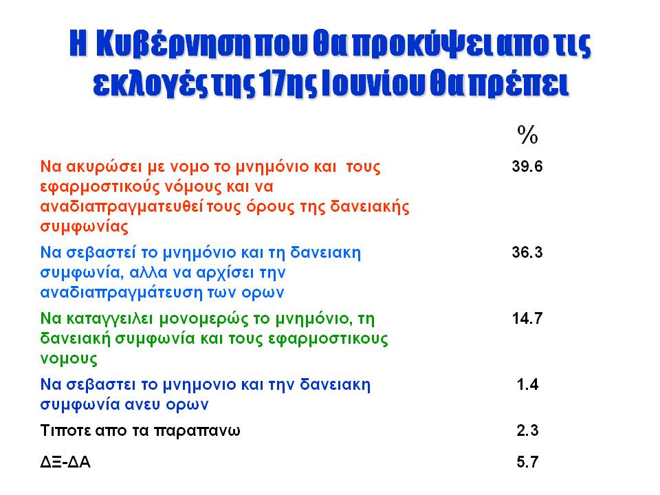 Την ίδια στιγμή το 41,9% τάσσεται υπέρ του σεβασμού των δεσμεύσεων που απορρέουν από το Μνημόνιο αλλά με την άμεση επαναδιαπραγμάτευση των όρων του.