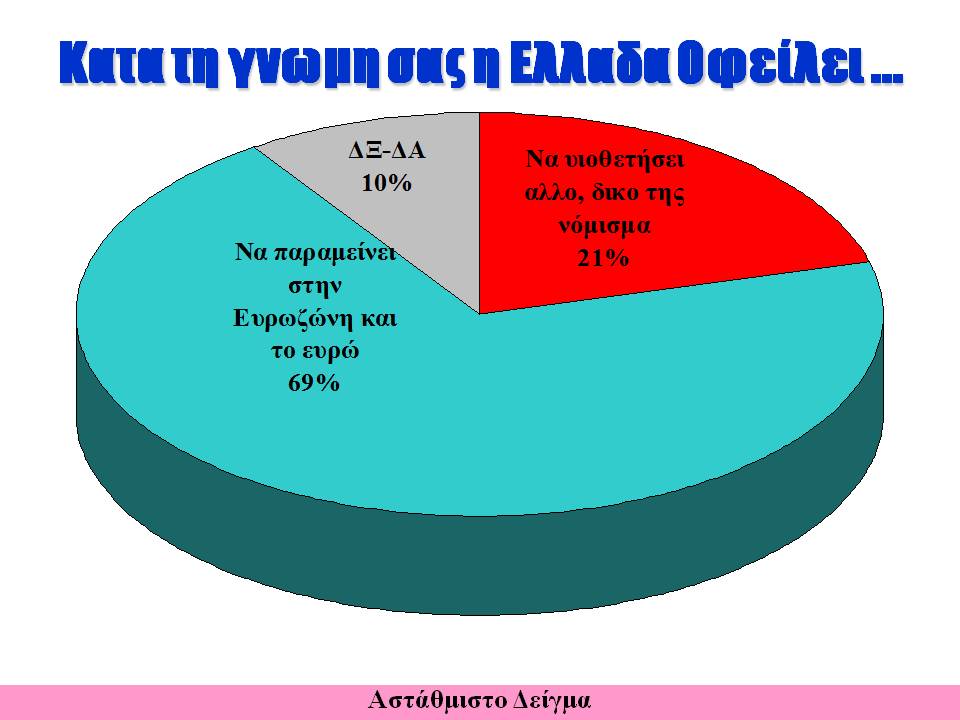 Παραμένουμε στην ίδια ενότητα ερωτημάτων. Στο επόμενο γράφημα καταγράφεται η τάση του εκλογικού σώματος ως προς το εάν και κατά πόσο η χώρα πρέπει να παραμείνει στην Ευρωζώνη και το ευρώ ή να υιοθετήσει άλλο νόμισμα. Εδώ η συντριπτική πλειοψηφία των συμμετεχόντων στη μέτρηση επιθυμούν την παραμονή της χώρας στη ζώνη του Ευρώ.