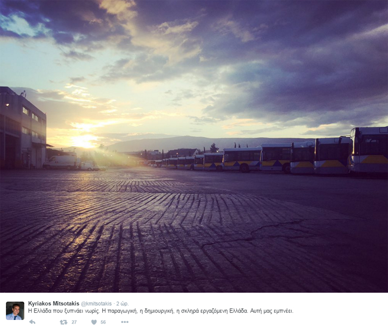 «Η Ελλάδα που ξυπνάει νωρίς. Η παραγωγική, η δημιουργική, η σκληρά εργαζόμενη Ελλάδα. Αυτή μας εμπνέει» έγραψε σε ανάρτησή του ο πρόεδρος της ΝΔ.