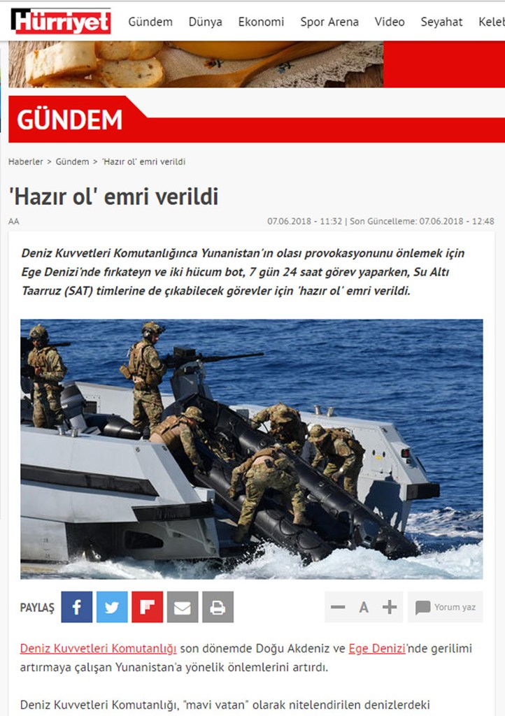 Με πρωτοσέλιδη ανάρτησή της, η εφημερίδα «Hürriyet» δημοσιοποιεί την απόφαση του Γενικού Επιτελείου Ενόπλων Δυνάμεων της Τουρκίας να θέσει σε 24ωρη ετοιμότητα μονάδες του τουρκικού στόλου καθώς και μη επανδρωμένα αεροσκάφη, τα οποία θα «χτενίζουν» το Αιγαίο.