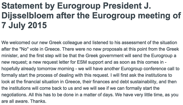 Μέσα σε αυτό το κλίμα, το Eurogroup αναμένει από την ελληνική κυβέρνηση να καταθέσει νέο αίτημα για παροχή οικονομικής βοήθειας από τον ESM την Τετάρτη, αναφέρει το επίσημο ανακοινωθέν του σημερινού Eurogroup. Όπως αναφέρεται, το Eurogroup είναι έτοιμο να πραγματοποιήσει έκτακτη τηλεδιάσκεψη την Τετάρτη, στον απόηχο του νέου ελληνικού αιτήματος, εφόσον αυτό υποβληθεί έγκαιρα.