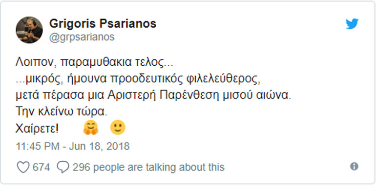 Σε ανάρτηση του στον προσωπικό του λογαριασμό γράφει «Λοιπόν, παραμυθάκια τέλος… …μικρός, ήμουνα προοδευτικός φιλελεύθερος, μετά πέρασα μια Αριστερή Παρένθεση μισού αιώνα. Την κλείνω τώρα. Χαίρετε!».