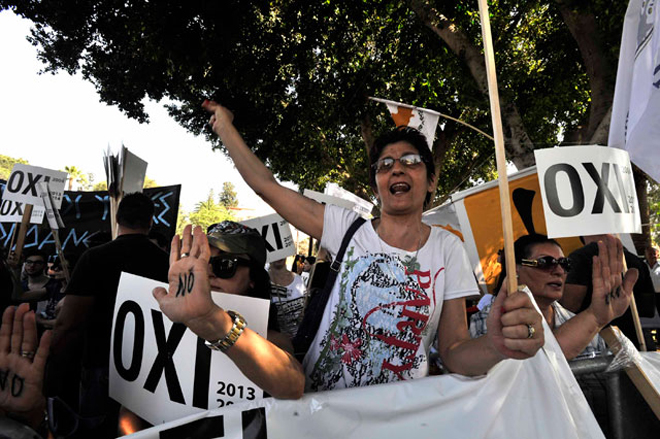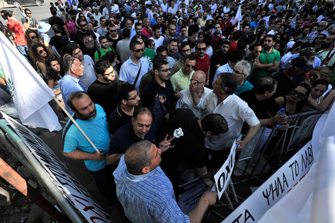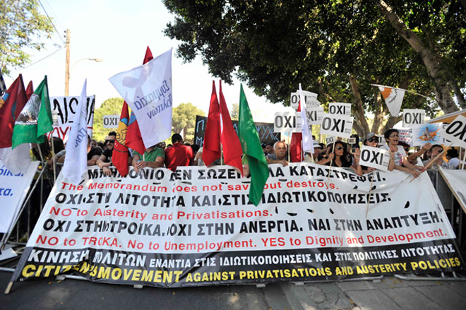 Οι διαδηλωτές φώναζαν συνθήματα όπως «Εξω η Τρόικα από την Κύπρο», «η Κύπρος δεν θα γίνει προτεκτοράτο», «Λαέ πολέμα σου πίνουνε το αίμα», ενώ αρκετοί κρατούσαν σημαίες της ΠΕΟ και της Συμμαχίας των Πολιτών, οι οποίες διοργάνωσαν δύο διαφορετικές εκδηλώσεις.