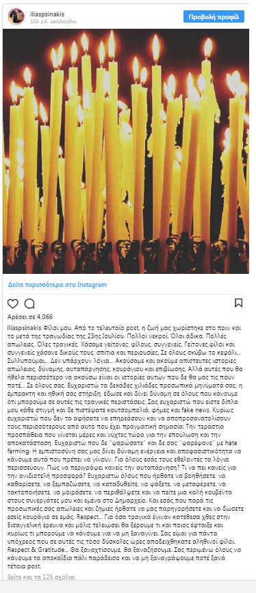 Για όσα τραγικά έγιναν κατέθεσα χθες στην Εισαγγελική έρευνα και μόλις τελειώσει θα ξέρουμε τι και ποιος έφταιξε και κυρίως τι μπορούμε να κάνουμε για να μη ξαναγίνει. Σας είμαι για πάντα υπόχρεος που σε αυτές τις τόσο δύσκολες ώρες αποδειχτήκατε αληθινοί φίλοι. Respect & Gratitude… Θα ξαναχτίσουμε, θα ξαναζήσουμε. Σας περιμένω όλους να κάνουμε τα αποκαΐδια πάλι παράδεισο και να μη ξαναγράψουμε ποτέ ξανά τέτοια post».