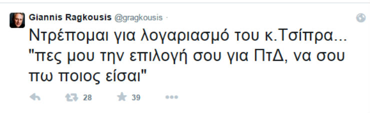 Σφοδρή επίθεση εναντίον του πρωθυπουργού εξαπέλυσε, μέσω Twitter, ο Γιάννης Ραγκούσης, με αφορμή την επιλογή του Προκόπη Παυλόπουλου για την Προεδρία της Δημοκρατίας.