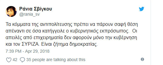 “Τα κόμματα της αντιπολίτευσης πρέπει να πάρουν σαφή θέση απέναντι σε όσα κατήγγειλε ο κυβερνητικός εκπρόσωπος. Οι απειλές από επιχειρηματία δεν αφορούν μόνο την κυβέρνηση και τον ΣΥΡΙΖΑ. Είναι ζήτημα δημοκρατίας” αναφέρει στην ανάρτηση της