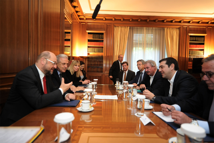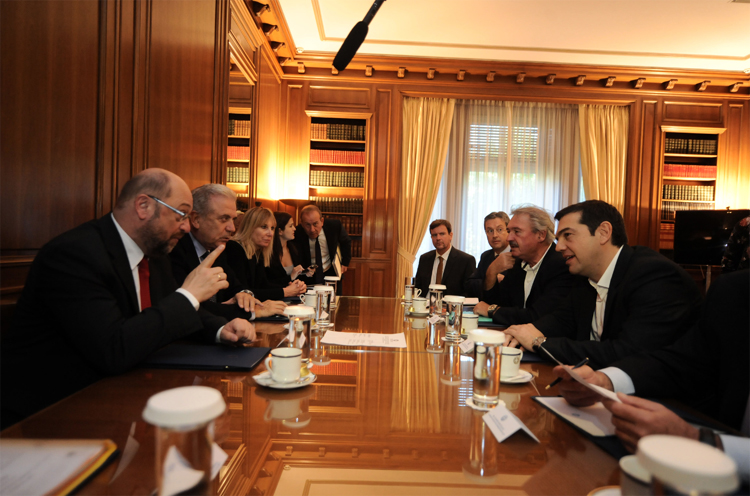 Συνάντηση με τον πρόεδρο του Ευρωπαϊκού Κοινοβουλίου Μάρτιν Σουλτς, τον υπουργό Εξωτερικών του Λουξεμβούργου Γιαν ‘Ασελμπορν και τον Ευρωπαίο Επίτροπο Μετανάστευσης, Εσωτερικών Υποθέσεων και Ιθαγένειας Δημήτρη Αβραμόπουλο είχε στο Μέγαρο Μαξίμου ο Αλέξης Τσίπρας.