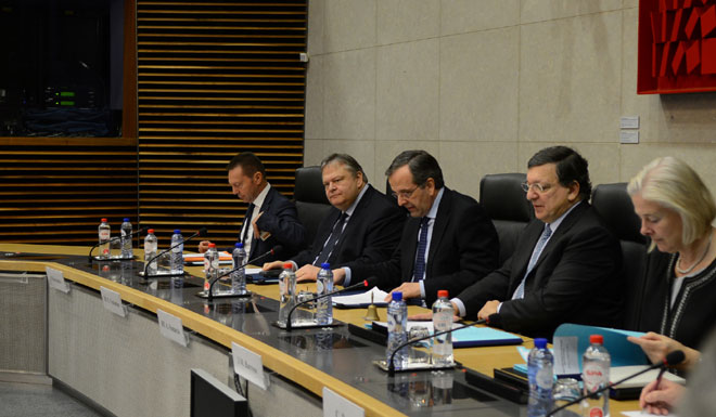 Η συνέντευξη Τύπου ξεκίνησε μετά την κοινή συνεδρίαση αντιπροσωπείας της ελληνικής κυβέρνησης και του Κολεγίου των Επιτρόπων. Εκ μέρους της ελληνικής κυβέρνησης, στη συνάντηση παραβρέθηκαν, εκτός από τον πρωθυπουργό, ο αντιπρόεδρος της κυβέρνησης, Ευάγγελος Βενιζέλος, ο Υπουργός Οικονομικών, Γιάννης Στουρνάρας καθώς και οι υπουργοί Χατζηδάκης, Δένδιας, Βαρβιτσιώτης, και Κούρκουλας.