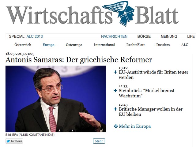 «Αντώνης Σαμαράς: ο Έλληνας μεταρρυθμιστής», τιτλοφορεί σημερινό δημοσίευμά της η αυστριακή οικονομική εφημερίδα «Βίρτσαφτσμπλατ» (Wirtschaftsblatt), στο οποίο σημειώνεται πως ο Έλληνας πρωθυπουργός εξέπληξε πολλούς στις Βρυξέλλες, καθώς μόλις πριν από ένα χρόνο η χώρα βρισκόταν στα πρόθυρα της χρεοκοπίας και τώρα γίνεται λόγος για μια ιστορία επιτυχίας.