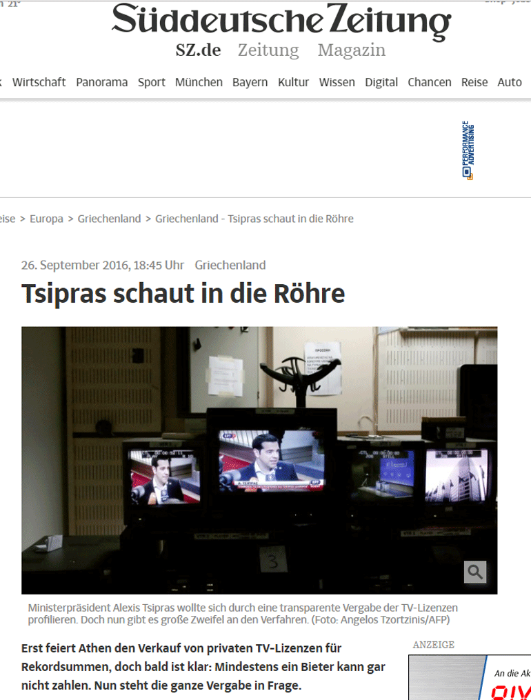 Τέλος, η Süddeutsche Zeitung γράφει: «Το πρόβλημα παρουσιάζεται στον κ. Τσίπρα σε μια ακατάλληλη στιγμή. Η δεύτερη αξιολόγηση για τις μεταρρυθμίσεις από τους ευρωπαίους δανειστές δεν έχει ολοκληρωθεί. Η Αθήνα περιμένει την νέα δόση ύψους 2,8 δισεκατομμυρίων ευρώ. Οι τηλεοπτικές άδειες δεν είναι αντικείμενο της αξιολόγησης. Η διαμάχη όμως θα αφήσει μια άσχημη εντύπωση στις Βρυξέλλες».