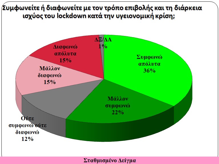 Πολύ μεγάλο ενδιαφέρον έχουν οι απαντήσεις των πολιτών στο επόμενο ερώτημα που αφορά το πώς εξέλαβαν την επιβολή του ολικού lockdown λόγω Covid-19. Το 58% των πολιτών, μία ισχυρή πλειοψηφία δηλαδή αλλά καθόλου ισοπεδωτική, συμφωνεί ή μάλλον συμφωνεί με τον τρόπο που επιβλήθηκε το lockdown. Αντιθέτως το ένα τρίτο των πολιτών δηλώνει πως διαφωνεί πλήρως ή μάλλον διαφωνεί. Ένα αξιοσημείωτο ποσοστό της τάξης του 12% δηλώνει πως ούτε συμφωνεί ούτε και διαφωνεί και δεν παίρνει ξεκάθαρη θέση. Είναι προφανές πως αυτό το διάγραμμα πρέπει να βάλει σε σκέψεις τα κέντρα λήψης αποφάσεων ως προς τις μελλοντικές κινήσεις που θα χρειαστούν να γίνουν σε περίπτωση δεύτερου – απειλητικού κύματος κορωνοϊού. Το κατά πόσο δηλαδή θα πρέπει να εφαρμοστεί όπως εφαρμόστηκε το lockdown ή αν πρέπει να προκριθεί άλλη εναλλακτική εφαρμογή.