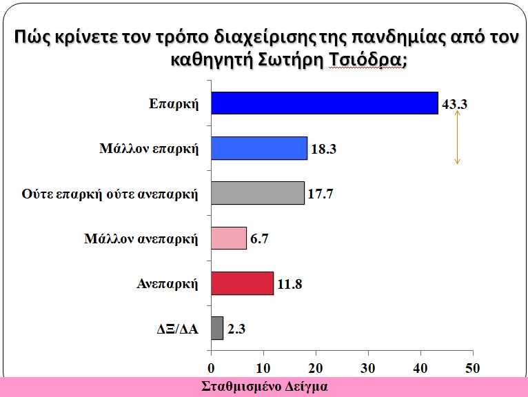 Έτσι το 43,3% των πολιτών εκτιμά πως η διαχείριση της πανδημίας από τον Σωτήρη Τσιόδρα ήταν επαρκής και το 18% πως ήταν μάλλον επαρκής. Σύνολο θετικών εκτιμήσεων 61,6%. Το ποσοστό αυτό απέχει πολύ από τα σαρωτικά ποσοστά που άγγιζαν ακόμα και το 90% όπως προ αρκετών εβδομάδων αποτυπώθηκαν σε δημοσιευμένες έρευνες της κοινής γνώμης. Ένα μεγάλο ποσοστό της τάξης του 17,7% δεν παίρνει θέση και εκτιμά πως ο τρόπος διαχείρισης της κρίσης από τον πανεπιστημιακό καθηγητή δεν ήταν ούτε επαρκής ούτε και ανεπαρκής. (Μπορεί κανείς να διαγνώσει μία «νότα» αρνητικότητας σε αυτή τη συγκεκριμένη στάση των πολιτών.