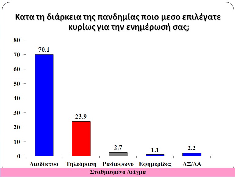Με το επόμενο ερώτημα επιχειρείται να ιχνηλατηθεί ο τρόπος με τον οποίο ενημερώνονταν οι πολίτες κατά τη διάρκεια της υγειονομικής κρίσης. Οι απαντήσεις έχουν εξαιρετικό ενδιαφέρον και αποτυπώνουν μία νέα πραγματικότητα. Με σαρωτική πλειοψηφία οι πολίτες επέλεξαν το Διαδίκτυο για την ενημέρωσή τους. Το 70% προτίμησε να ενημερώνεται από τις ενημερωτικές ιστοσελίδες αφήνοντας σε απόσταση την Τηλεόραση, η οποία συγκέντρωσε μόνον το 23,9% των προτιμήσεων των πολιτών. Μόνον το 2% δήλωσε πως προτίμησε το Ραδιόφωνο για την ενημέρωση του, ενώ μόνον το 1,1% έκανε χρήση έντυπου τύπου. Τα συμπεράσματα είναι ξεκάθαρα. Σε περίπτωση μείζονος κρίσης οι πολίτες στρέφονται στο διαδίκτυο για την άμεση και πολυδιάστατη ενημέρωσή τους. Το ίντερνετ διαδραματίζει πλέον τον ρόλο που μονοπωλιακά διατηρούσε η τηλεόραση τις περασμένες δεκαετίες.