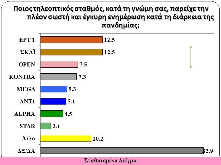 Αποτυπώθηκε και ένα πολύ μεγάλο ποσοστό της τάξης του 32,9%, το οποίο δηλώνει «Δεν ξέρω/Δεν απαντώ». Αυτό το ποσοστό που αντιστοιχεί στο ένα τρίτο της κοινής γνώμης προφανώς και δεν απαξιώνει την ενημέρωση ούτε και δηλώνει πως δεν ενημερωνόταν κατά την πανδημία από τη στιγμή που κάποιες πληροφορίες ήταν ζωτικής σημασίας για την καθημερινή ζωή του πολίτη. Θα μπορούσε αναμφίβολα κανείς να εκτιμήσει πως αυτό το 32,9% απαξιώνει τα συστημικά ΜΜΕ. Είναι θέμα προς συζήτηση και συστηματική ανάλυση και πάντως είναι βασικό ζήτημα προβληματισμού για το πώς αντιμετωπίζει η κοινωνία το μείζον ζήτημα της ενημέρωσης και το κατά πόσο η κοινωνία αυτή εμπιστεύεται τη συστημική παραγωγή της ενημέρωσης.