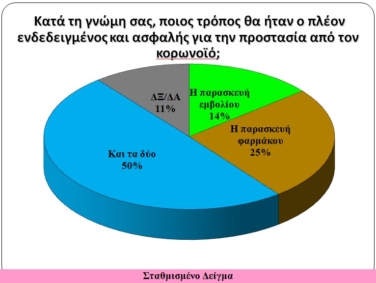 Το 14%, πολύ περιορισμένο ποσοστό, εναποθέτει τις ελπίδες του στην Παρασκευή εμβολίου, ενώ το 25% στην παρασκευή φαρμάκου κατά του κορωνοϊού. Το 50% δηλώνει πως ο συνδυασμός εμβολίου και φαρμάκου θα ήταν η ασφαλέστερη προοπτική.