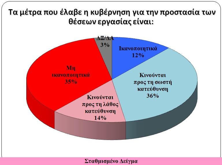 Έτσι στο επόμενο διάγραμμα βλέπουμε πως το 36% των πολιτών κρίνει πως τα μέτρα που ελήφθησαν για την προστασία των θέσεων εργασίας κινούνται προς τη σωστή κατεύθυνση. To 12% κρίνει πως οι κινήσεις αυτές είναι ικανοποιητικές. Δηλαδή ένα σύνολο της τάξης του 48% έχει θετική στάση έναντι των κυβερνητικών χειρισμών. Αντιθέτως το 49% των πολιτών διατηρεί αρνητική στάση για τους κυβερνητικούς χειρισμούς εκτιμώντας πως τα εξαγγελθέντα μέτρα κινούνται σε λάθος κατεύθυνση (35%) ή δεν είναι ικανοποιητικά (14%).